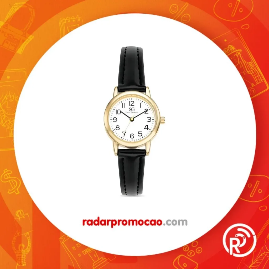 Relógio Feminino Dourado Saint Germain 24mm Correia Preta Caixa Dourada Fundo Branco Elegante Clássico Delicado