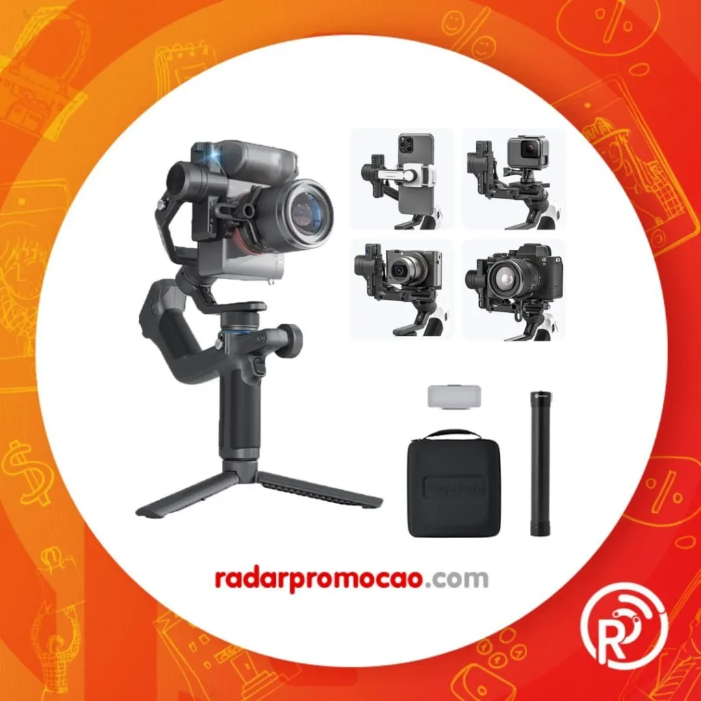 FeiyuTech Combo SCORP Mini-2: bolsa portátil + poste de fibra de carbono de 28 cm + luz de preenchimento, estabilizador de câmera de 3 eixos tudo em um, rastreador de IA integrado para câmera sem